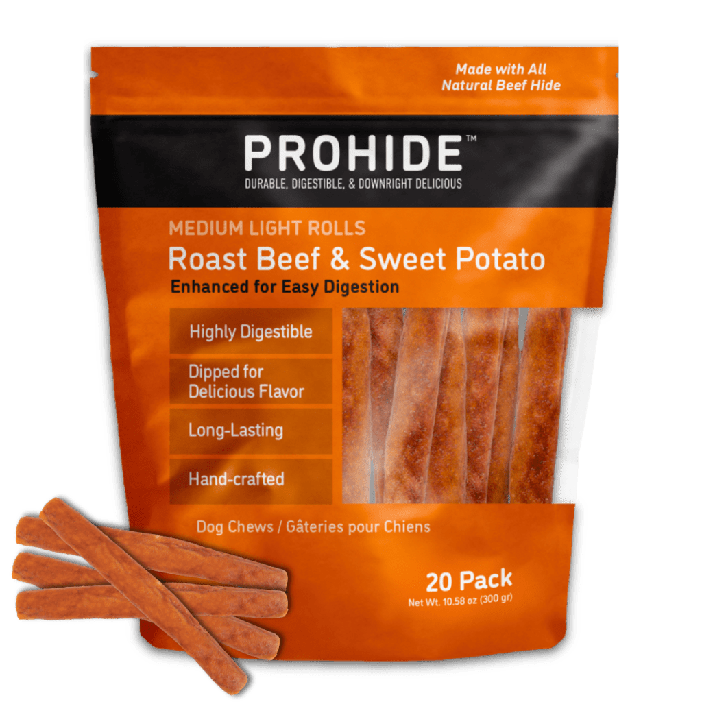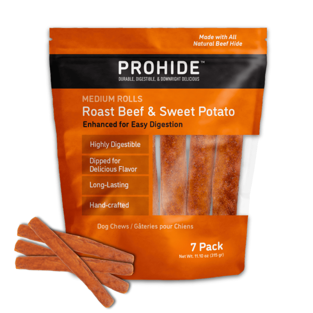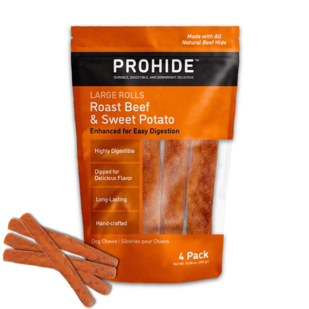 ProHide Rolls are healthy, all natural, rawhide free alternative dog chews that feature beef + collagen as the #1 ingredient. Made of hydrolyzed collagen peptides, they are an all-natural source of protein, and are highly digestible. They are scientifically-tested to last two times longer than leading rawhide alternatives.
