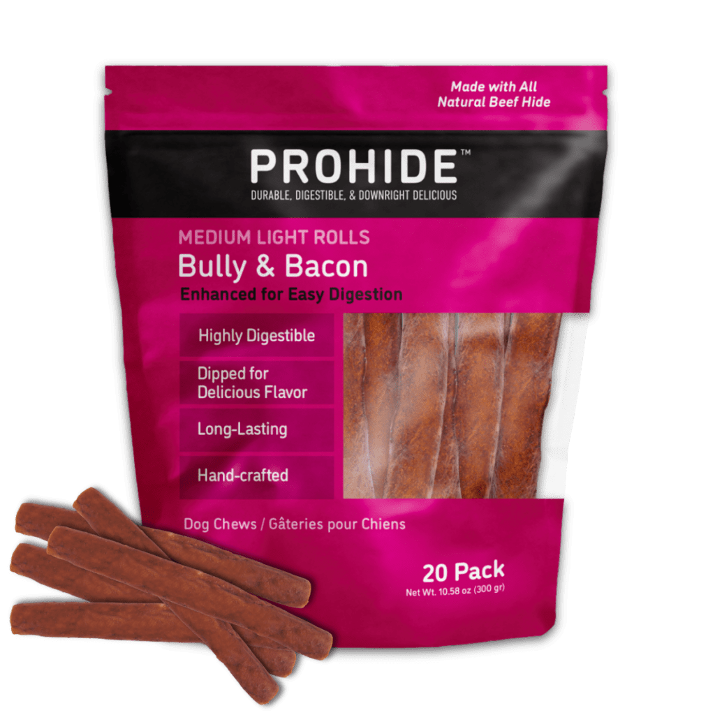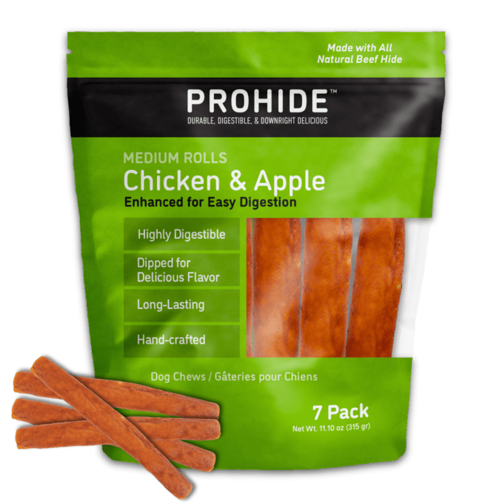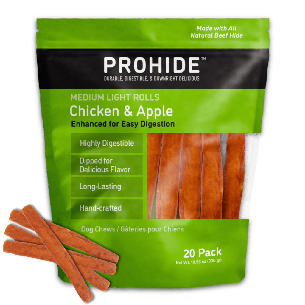 ProHide Rolls are healthy, all natural, rawhide free alternative dog chews that feature beef + collagen as the #1 ingredient. Made of hydrolyzed collagen peptides, they are an all-natural source of protein, and are highly digestible. They are scientifically-tested to last two times longer than leading rawhide alternatives.